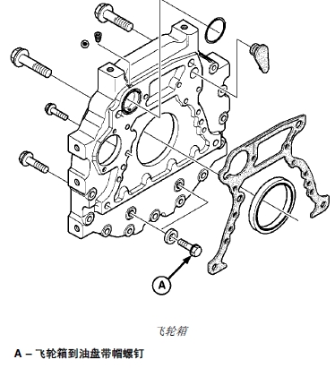 飛輪殼到油盤的帶帽螺釘(A)(如果需要)-扭矩 . . . . . . . . 280 牛頓米(207 磅- 英尺)