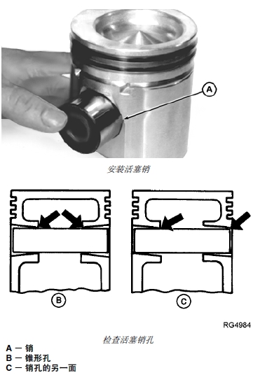 3. 從孔兩端插入活塞銷檢查活塞銷孔錐度。如果活塞銷可以自由地通過(guò)一端而被卡在中心,那么孔可能已成錐形 (B)。