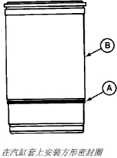 5. 將汽缸套 (B) 上下倒置,并在汽缸套外圈上安裝氯?。ǘ┫鹉z四方形密封圈 (A)。