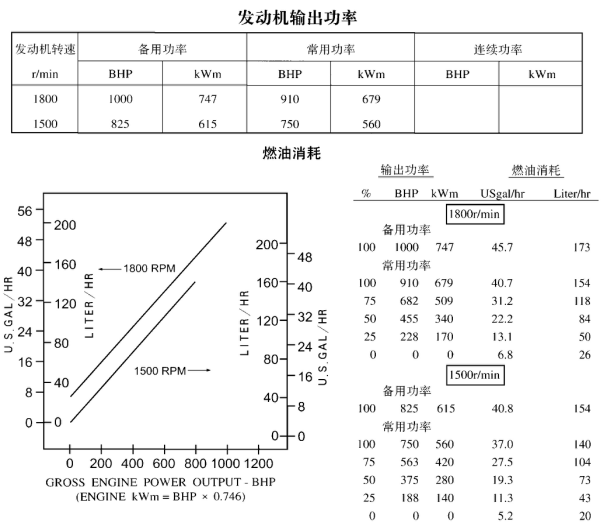 所有的數(shù)據(jù)均是基于發(fā)動(dòng)機(jī)帶燃油泵、水泵、機(jī)油泵、空濾器和消聲器運(yùn)轉(zhuǎn)時(shí)獲得的,但不帶有充電機(jī)、空壓機(jī)、風(fēng)扇、選用設(shè)備和驅(qū)動(dòng)件。所有的數(shù)據(jù)都是基于ISO 3046標(biāo)準(zhǔn)參考的條件—海拔110m(361ft),大氣壓力100kPa(29.53inHg),進(jìn)氣溫度25℃ (77°F),相對(duì)濕度30%,使用標(biāo)準(zhǔn)No.2號(hào)柴油或符合ASTM D975的柴油。