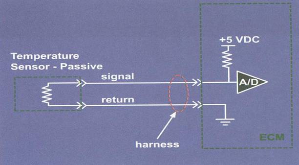 下圖所示為溫度傳感器的工作原理。隨著溫度的升高,熱敏電阻值降低,從而使信號電壓降低,根據(jù)溫度傳感器的工作原理,可以用檢查熱敏電阻阻值的方法檢查溫度傳感器,通過對比實際測量所得的電阻值和參數(shù)表中的電阻值,即可判斷傳感器是否正常工作。