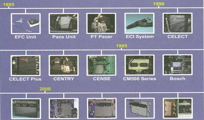 由于電控柴油機燃油系統(tǒng)的多樣性,康明斯有多種不同型號的ECU(M)用在不同型號的發(fā)動機上。下圖列出了不同年代在康明斯發(fā)動機上使用的ECU(M)。這些ECU(M)具有不同的零件號,在訂購時請注意。