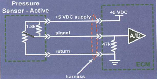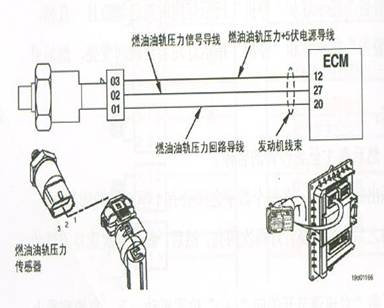 康明斯發(fā)動機上使用的壓力傳感器有兩種不同的工作原理,一種是電容式壓力傳感器,另外一種是壓電晶體式。兩種傳感器均為三線式,兩根電源線向傳感器提供5伏的工作電壓,一根信號線向ECU(M)提供壓力信號電壓。