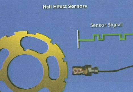 在速度信號輪上做出一個異形的輪齒或其他的標記,速度傳感器即可以測量出曲軸或凸輪軸的位置,所以速度傳感器也可以是發(fā)動機位置傳感器。通常我們將安裝在凸輪軸上的傳感器叫位置傳感器,安裝在曲軸上的傳感器叫速度傳感器。