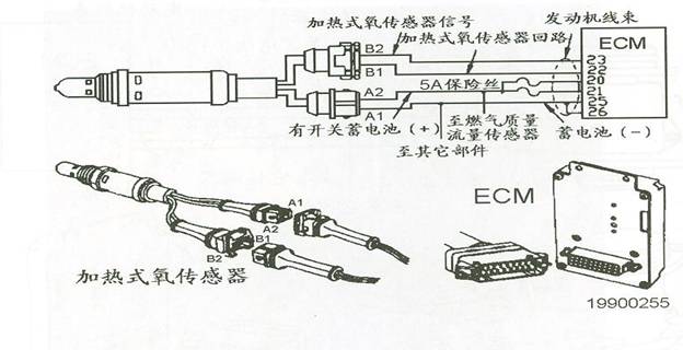 氧傳感器用來檢測發(fā)動機廢氣中氧含量,并發(fā)信號給ECU(M)。電子控制模塊(ECU(M))通過HOS來計算發(fā)動機運行時的實際空燃比,并根據(jù)運算結(jié)果來調(diào)整燃料的供給,從而獲得最佳的排放水平
