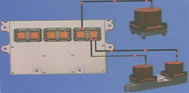 ECU(M)通過輸入設備輸入的參數(shù),通過內(nèi)部程序的計算,向各輸出設備輸出控制指令,由于電控柴油系統(tǒng)的多樣性,各種不同的電控燃油系統(tǒng),其所具有的執(zhí)行元件各不相同,以系統(tǒng)最主要的輸出設備,實現(xiàn)噴油量和噴油正時控制的執(zhí)行元件為例。中馬力共軌系統(tǒng)通過噴油器來直接實現(xiàn)對噴油量和噴油正時的控制,而有些燃油系統(tǒng)通過單個電磁閥實現(xiàn)所有六個缸的控制。