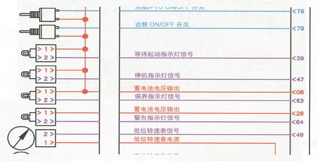 電路圖中的顏色:康明斯原裝的電路圖為彩色圖,圖中線路總共有五種顏色,分別是紅色、藍色、黑色、紫色、和綠色。紅色代表系統(tǒng)供電電路的火線,包括電瓶向ECU(M)的供電電路火線和ECU(M)向輸入輸出設備供電電路的火線;藍色代表輸入設備向ECU(M)輸入信號的信號電路,包括各種開關和傳感器及油門的輸出信號線;黑色代表供電電路的地線,包括電瓶回路的地線和ECU(M)向輸入輸出設備供電的地線;紫色代表ECU(M)向輸出設備提供控制信號的控制信號線;綠色為數(shù)據(jù)通信線路。
