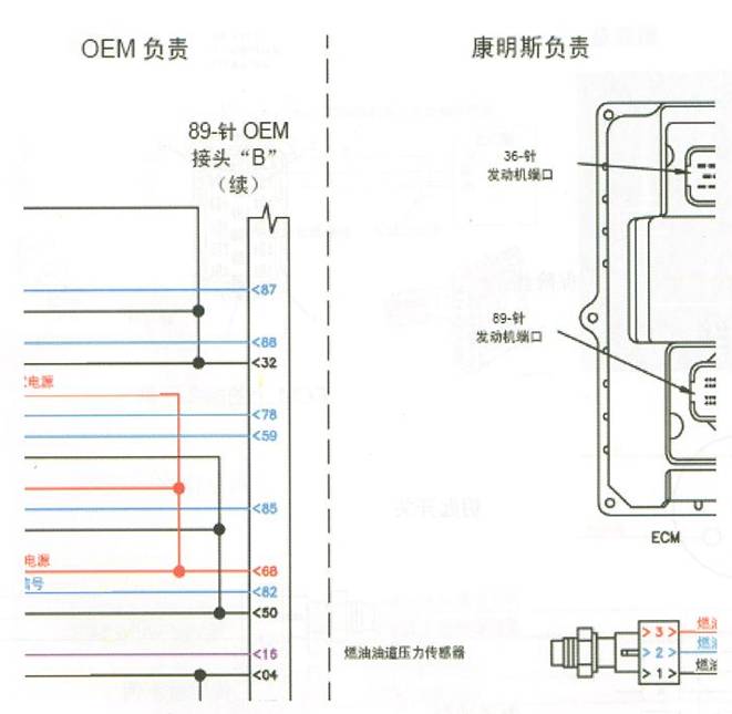 需要指出的是,在實際的設備中,主機廠的電路連接不會完全和康明斯原裝電路圖中的接法一樣。這是因為康明斯電路圖中推薦的接法包含了發(fā)動機所有的特性,而主機廠在安裝時有些控制功能可能不啟用,或者在康明斯允許的前提下對電路作一定的改動。