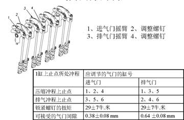 應(yīng)調(diào)節(jié)的氣門的缸號(hào)進(jìn)氣門1、2、4 3、5、6 29±7牛.米 0.38±0.08 mm