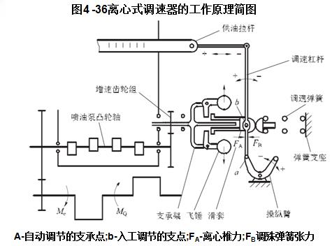 柴油機在工作時,通過曲軸驅(qū)動裝在噴油泵凸輪軸后端上的飛錘旋轉(zhuǎn),飛錘受離心力的作用而向外飛開。此離心力產(chǎn)生的推力FA和調(diào)速彈簧的張力FB。在某一轉(zhuǎn)速下相平衡,而使調(diào)速器和噴油泵保持在一定的位置下工作。