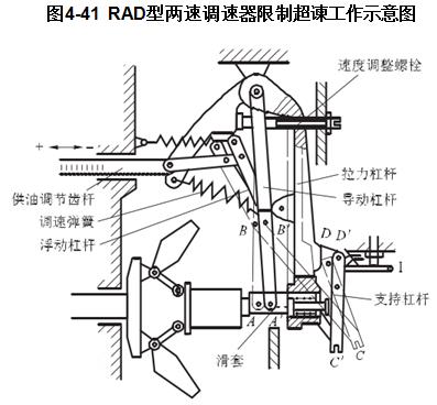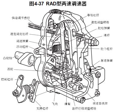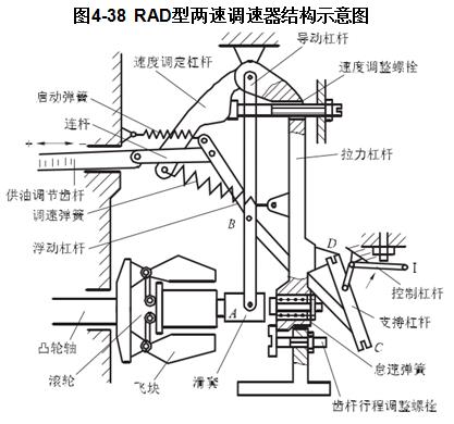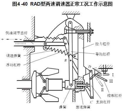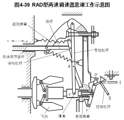 圖4 - 37所示為CA1091 K3型載貨汽車柴油機所用的RAD型兩速調(diào)速器,其調(diào)速原理結(jié)構(gòu)示意圖如圖4-38所示。