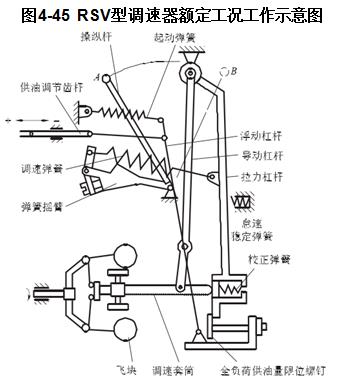 ③額定工況。如圖4-45所示,當駕駛員將加速踏板踩到底,使操縱處于極限位置A時,調(diào)速彈簧達到最大拉伸狀態(tài),此時拉力最大。張緊的調(diào)速彈簧將拉力杠桿拉靠在全負荷供油量限位螺釘上,并通過調(diào)速套筒、導(dǎo)動杠桿和浮動杠桿將供油調(diào)節(jié)齒桿推至全負荷供油位置,亦即柴油機在額定工況下工作。此時,飛塊的離心力與調(diào)速彈簧的作用力平衡。