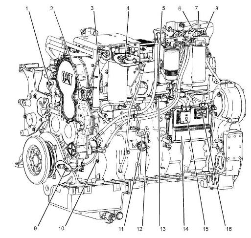 圖4發(fā)動(dòng)機(jī)左側(cè)視圖(范例)(1) 發(fā)動(dòng)機(jī)冷卻溫度傳感器(2) 次速度/時(shí)間感應(yīng)塞(3) 進(jìn)氣歧管壓力傳感器(4) 噴油器閥蓋進(jìn)口接頭(5) 進(jìn)氣歧管空氣溫度傳感器(6) 壓差開(kāi)關(guān)(燃油)(7) 燃油壓力感應(yīng)塞(8) 燃油溫度傳感器(9)主速度/時(shí)間感應(yīng)塞(10) 正時(shí)校準(zhǔn)口(11) 大氣壓力感應(yīng)塞(12) 機(jī)油壓力感應(yīng)塞(13) 正時(shí)校準(zhǔn)探針接口(14) 發(fā)動(dòng)機(jī)控制模塊(ECM)(15) J2/P2 ECM 接頭 (16) J1 ECM 接頭