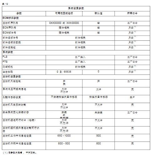 系統(tǒng)設(shè)置參數(shù)SMCS代碼:1901S/N:JMS1-Up;LHX1-UpS/N:MHG1-Up;LHX1-UpS/N:A8J1-Up;LHX1-Up系統(tǒng)設(shè)置參數(shù)是特別設(shè)定的發(fā)動機排放水平、功率范圍和特別應(yīng)用的參數(shù)。參數(shù)的默認(rèn)值由工廠編程設(shè)定。一些參數(shù)可以改變以適合發(fā)動機的特殊應(yīng)用。如果電子控制模塊(ECM)更換,必須重新載入系統(tǒng)設(shè)置參數(shù)。如果你更新ECM快存文檔,則不必重新載入系統(tǒng)設(shè)置參數(shù)。某些設(shè)置參數(shù)被標(biāo)記在發(fā)動機信息銘牌上。注意:如果受工廠密碼保護(hù)的參數(shù)被改變,卡特免除擔(dān)保責(zé)任。參數(shù)描述發(fā)動機序列號編入“發(fā)動機序列號”以匹配標(biāo)記在發(fā)動機銘牌上的發(fā)動機序列號。發(fā)動機序列號不預(yù)先編入替換的ECM中。ECM部件號該參數(shù)標(biāo)示了ECM的部件號。ECM序列號該參數(shù)標(biāo)示了ECM的序列號。軟件組部件號該參數(shù)表示當(dāng)前裝入ECM中的快存文檔的部件號。軟件組版本數(shù)據(jù)該參數(shù)表示當(dāng)前裝入ECM中的快存文檔的版本數(shù)據(jù)。