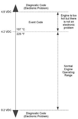 典型模擬溫度傳感器的輸出電壓圖8表示了一個典型模擬傳感器的信號范圍。如果傳感器輸出信號低于0.2 VDC或高于4.8 VDC,就會生成診斷代碼。 動態(tài)診斷代碼激活的診斷代碼代表了電氣控制系統(tǒng)的問題。盡可能快地糾正問題。當(dāng)生成一個動態(tài)診斷代碼時,“ 動態(tài)警告” 指示燈(在卡特ET“ 發(fā)動機控制警告狀態(tài)” 上)被激活,以警告操作者。如果生成卡特cat代碼的情況是暫時的,信息會從動態(tài)診斷代碼清單中消失。診斷代碼變?yōu)槿罩尽?br />