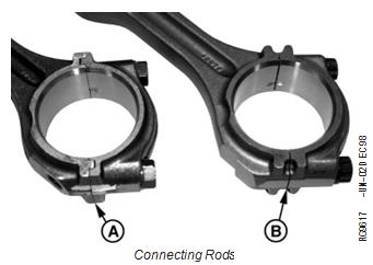早期的強(qiáng)鹿約翰迪爾John Deere柴油發(fā)動(dòng)機(jī)在連桿和蓋(A)之間有傳統(tǒng)的榫槽。后來(lái)的強(qiáng)鹿約翰迪爾John Deere柴油發(fā)動(dòng)機(jī)有精密接頭 桿和蓋(B)。