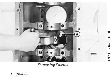 8. Gently tap piston (A) through top of cylinder block from the bottom. Once piston rings have cleared cylinder liner bore, hold on to piston to prevent piston from dropping.