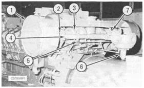 燃氣通過主燃氣供應(yīng)管進入燃氣壓力調(diào)節(jié)器(6)??梢杂萌細鈮毫φ{(diào)節(jié)器將燃料的流量調(diào)節(jié)成低壓以供應(yīng)卡特CAT發(fā)動機進氣管路(4)。當(dāng)渦輪增壓器(3)的壓縮機飛輪轉(zhuǎn)動后,燃料(低壓)開始通過燃料引入管路流入化油器(2)?;推鳎ㄌ?/span>CAT發(fā)動機兩側(cè)各一個)位于空氣過濾器(1)之間,和渦輪增壓器的壓縮機同側(cè)?;推鲗⑷剂吓c從空氣過濾器進入的空氣混合。空氣/燃料混合物被吸入渦輪增壓器,然后被壓縮并送到后冷卻機。這些被壓縮的、冷卻的空氣/燃料混合物從后冷卻機流向節(jié)流組。節(jié)流組通過連桿與調(diào)節(jié)器相連,能控制空氣/燃料混合物進入進氣室的流量。進氣室內(nèi)的空氣/燃料混合物通過汽缸進氣閥進入汽缸,并且在汽缸中被壓縮,而后被火花塞點燃。