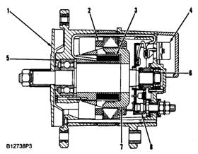 (1)風(fēng)扇(2)定子繞組(3)勵(lì)磁繞組(4)穩(wěn)壓器(5)滾珠軸承(6)滾柱軸承(7)轉(zhuǎn)子(8)整流器組件