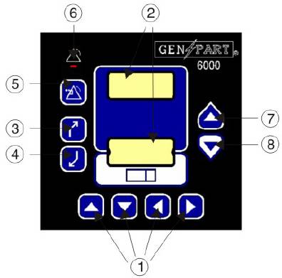 2. 液晶體顯示屏-藍(lán)顯示屏供讀取發(fā)電機(jī)組運(yùn)行參數(shù),白顯示屏供輸入密碼和改變程序狀態(tài)。