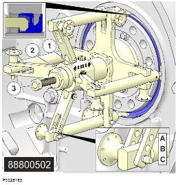 1 調(diào)整臂 88800501 安裝工具 并安裝工具。設(shè)定直徑:使用 A. Ø 151 前密封件 D13。1 前進(jìn):掛鉤松開向后:掛鉤扣緊2 張緊螺母3 緩慢拉出密封件。安裝重要事項(xiàng)!密封環(huán)的金屬側(cè)必須向內(nèi)。
