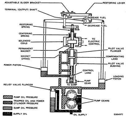 當(dāng)輸入到螺形線圈中的電壓信號(hào)增加時(shí)(由于加重負(fù)載或增加設(shè)定速度),發(fā)生的情況剛好與前一種相反。這時(shí),來自線圈的向下的力將增大,推動(dòng)導(dǎo)向閥活塞向下移動(dòng),動(dòng)力活塞與拉伸杠桿上移,從而減小拉伸彈簧產(chǎn)生的向下的力。當(dāng)終端軸轉(zhuǎn)動(dòng)到新的燃料需求所需位置時(shí),拉伸彈簧力所增加的數(shù)量將同螺型線圈中電流產(chǎn)生的向下的力的減小數(shù)量相等,于是作用到導(dǎo)向閥活塞上的力會(huì)成為平衡力,它又將被推回到中間位置。