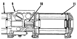 當(dāng)手柄(4)被拉到“輔運(yùn)轉(zhuǎn)”位置時(shí),潤(rùn)滑油會(huì)被輔助濾芯清理掉。過濾后的油會(huì)經(jīng)檢驗(yàn)閥(10)向右流并阻塞主倉內(nèi)的油路。在這個(gè)位置,當(dāng)油壓消失后,主過濾管將被更換,主倉會(huì)被抽空。