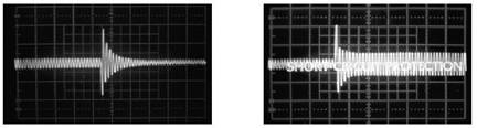 耐受短路電流能力 一臺工作在滿負荷下的發(fā)電機組3相對稱短路——最嚴重的情況——顯示在兩示波器屏幕上。左邊的軌跡顯示工作在額定電流下的常規(guī)無刷發(fā)電機在短路時,由沖擊電流逐漸減少至低于額定電流。右邊屏幕上的軌跡顯示的是額定值一樣的快速響應Ⅱ發(fā)電機,工作在同樣情況下,其電流升高至超出其額定水平,從而能夠跳開支路斷路器。