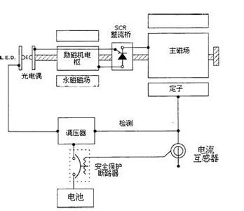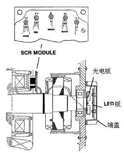 LED裝在發(fā)電機軸的端部,對著在軸上旋轉的光敏晶體管。光敏晶體管接收來自LED的信號,按要求比如調(diào)壓器的指令來指示SCR旋轉橋開通或關斷。