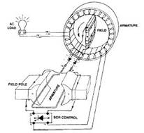 這種發(fā)電機通常采用一小型的旋轉電樞發(fā)電機來給主發(fā)電機磁場繞組提供勵磁電源。該電源由一個二極管整流橋將交流變換成直流。這個電樞與主磁場同軸旋轉,因此不需要滑環(huán)和電刷。由于這種勵磁發(fā)電機的磁場繞組是固定的,因此其調(diào)節(jié)控制電路可以直接連接,這又消除了對電刷與滑環(huán)的需要。一個SCR(可控硅)勵磁/穩(wěn)壓器被用來給磁場提供整流的直流電。SCR電路的輸入功率來自主電樞(定子)的輸出。