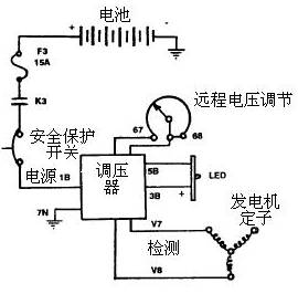 調(diào)壓器檢測發(fā)電機的輸出電壓,并按輸出電壓的幅度使固定的LED(發(fā)光二極管)亮或者滅。調(diào)壓器的電源由發(fā)電機組電池提供。