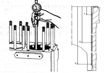 注意:結(jié)合氣閥導(dǎo)筒內(nèi)徑的測量結(jié)果,計(jì)算閥桿及導(dǎo)筒的間隙。當(dāng)間隙超過更換極限時(shí),更換磨損嚴(yán)重的閥。