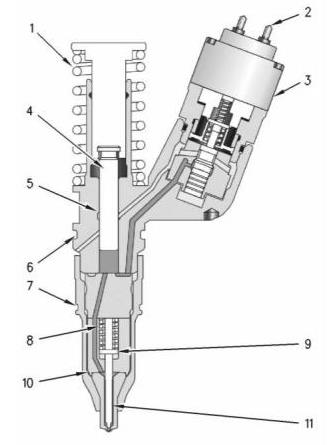 當(dāng)電子單體噴油器機(jī)構(gòu)將力傳遞到電子單體噴油器的頂部時(shí),彈簧(1)被壓縮,柱塞(4)向下驅(qū)動(dòng)。此操作通過電磁閥總成(3)中的閥將燃油置換到燃油箱的回油歧管中。當(dāng)柱塞向下移動(dòng)時(shí),缸筒(5)中的油道被柱塞的外徑封閉。閥體(10)內(nèi)和沿單向閥(11)至噴油器尖端的油道中已經(jīng)含有用于噴射的燃油。當(dāng)柱塞缸中的油道關(guān)閉后,噴油器隨時(shí)準(zhǔn)備噴射。噴射的開始依賴于電子控制模塊(ECM)中的軟件。