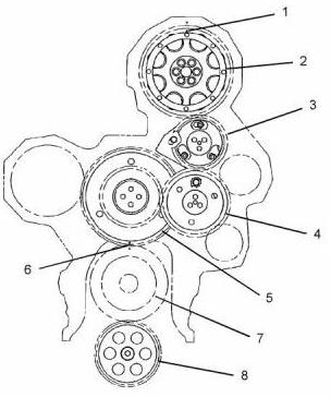 正確噴油正時和氣門機構(gòu)操作的基礎(chǔ)由前齒輪總成正時的對準決定。正時標記(1)到正時標記(6)對齊,以便在活塞移動和氣門移動之間提供正確的關(guān)系。