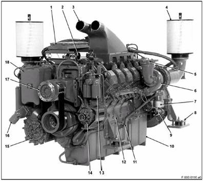 柴油機總體結(jié)構(gòu)一般包括上述幾大系統(tǒng),但由于汽缸數(shù)、汽缸排列方式和冷卻方式的不同,因此,各種機型在結(jié)構(gòu)上略有差異。德國奔馳MTU柴油機的基本結(jié)構(gòu),如下圖所示。