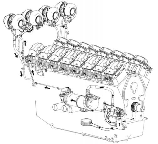 Perkins4016柴油發(fā)動(dòng)機(jī)正時(shí)齒輪由兩側(cè)油道潤滑。齒輪系中兩個(gè)惰輪的軸承通過曲軸箱端部的凹槽用油道側(cè)面的機(jī)油潤滑。氣門齒輪由機(jī)油濾清器底座供應(yīng)的機(jī)油潤滑。機(jī)油管連接曲軸箱和油軌,以向氣門齒輪供油。機(jī)油通過支軸上沿雙頭螺柱的凹槽輸送至每個(gè)缸蓋,然后流向搖臂軸。搖臂軸中的徑向孔將機(jī)油輸送至搖臂的軸承。機(jī)油自主油道端部通過曲軸箱機(jī)油孔輸送至渦輪增壓器。用條管路輸送A排濾清器后的機(jī)油,以向V形中央的挺桿供油。