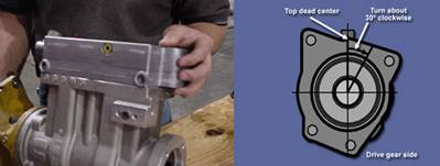 康明斯Cummins QSK23發(fā)動(dòng)機(jī)用手轉(zhuǎn)動(dòng)空氣壓縮機(jī)直至上止點(diǎn)。面向空壓機(jī)驅(qū)動(dòng)齒輪側(cè),將空壓機(jī)順時(shí)針轉(zhuǎn)大約30度角,裝上空壓機(jī)。