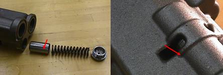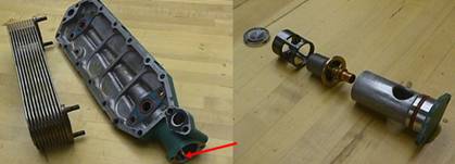 康明斯Cummins QSK23發(fā)動(dòng)機(jī)在每個(gè)機(jī)油濾清器內(nèi)都有一個(gè)旁通閥,設(shè)定開啟壓力為 241 kp (35PSI).濾清器阻力過大時(shí),旁通閥前后壓差使其克服彈簧力開啟。這使得機(jī)油旁通流過濾清器,向發(fā)動(dòng)機(jī)提供機(jī)油
