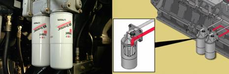 康明斯Cummins QSK23發(fā)動(dòng)機(jī)左側(cè)裝有兩個(gè)弗列加 LF9325 機(jī)油濾清器。濾清器內(nèi)有30微米全流濾清介質(zhì)及10 微米旁通濾清介質(zhì)。省去了旁通濾清器部分。