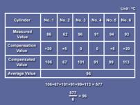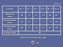 康明斯Cummins QSK23發(fā)動機看另外一組數(shù)據(jù),我們先根據(jù)氣缸所在位置對每缸的測試數(shù)據(jù)進行補償。下一步,計算平均值。最后,把每個缸的數(shù)據(jù)和平均值作對比。 在此例中,2號氣缸低于平均值超過20℃,被認為是不正常的。