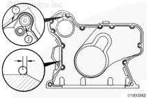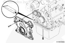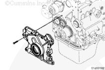 注: 安裝三個(gè)導(dǎo)向銷(零件號(hào) 3164977)以改進(jìn)前蓋和前油封與齒輪室和曲軸的對(duì)準(zhǔn)情況。