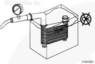 如圖所示,堵住機(jī)油冷卻器芯,并連接至壓縮空氣源。對每個(gè)機(jī)油冷卻器芯進(jìn)行壓力測試,以檢查有無泄漏。