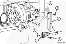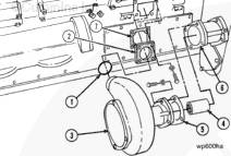 拆下將支架 (4) 固定到缸體上的兩個螺釘和重型墊圈 (6)。拆下將殼體 (2) 固定到水泵 (3) 上的四個螺釘。注意兩個墊圈 (5) 為重型墊圈。拆下支架。從泵上拉下殼體。拆下并廢棄 O 形圈 (1)。