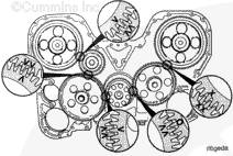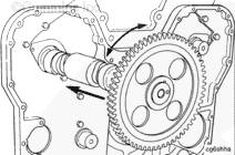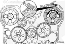 三個(gè)惰輪、兩個(gè)凸輪軸齒輪和曲軸齒輪都帶有裝配時(shí)用于對(duì)正的標(biāo)記。未正確對(duì)準(zhǔn)會(huì)造成發(fā)動(dòng)機(jī)嚴(yán)重?fù)p壞。