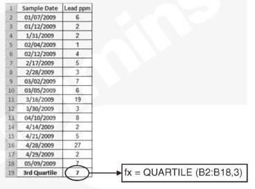 在 Mi c rosoft Ex c el® 中使用 “fx” 函數(shù)可以計算第三四分位數(shù)。此例中第三四分位數(shù)處的鉛含量數(shù)值為 7 ppm。