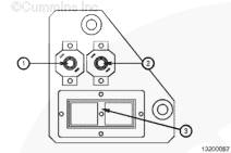 康明斯電子控制船用發(fā)動機(jī)配備了 2 個斷路器,位于發(fā)動機(jī)的 ECM 側(cè)。5 安斷路器 (1) 用于鑰匙開關(guān)控制的 ECM 電源,10 安斷路器 (2) 用于非鑰匙開關(guān)控制的面板電源。電路斷路器板上還安裝有 40-針 OEM 接頭(3)。