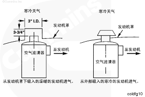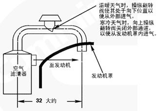 C [10°F] 時,按照圖 9 或 10 的進氣設計,從發(fā)動機罩下吸進空氣,以防止空氣濾清器堵塞。