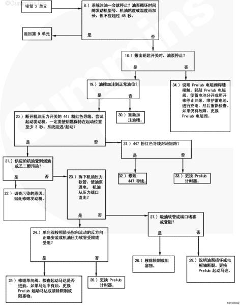如果操作者表明點火一點不工作,確保他繼續(xù)在拖動位置持續(xù)打火 3 至 4 秒。如果發(fā)動機在短時間延遲后拖動,這表明壓力開關的接地已經(jīng)斷開。感應無接地(即機油壓力),PRELUB™ 裝置將繼續(xù)進行延遲和拖動。