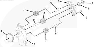 1機(jī)油泵驅(qū)動(dòng)齒輪,2機(jī)油泵泵體,3機(jī)油泵蓋,4襯套,5 O 形密封圈,6機(jī)油泵從動(dòng)齒輪軸,7機(jī)油泵驅(qū)動(dòng)齒輪,8機(jī)油泵主驅(qū)動(dòng)齒輪,9機(jī)油泵主驅(qū)動(dòng)軸,10六角頭螺栓 (5) - M8 x 1.25 x 20。