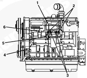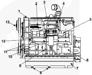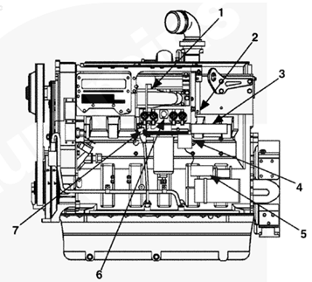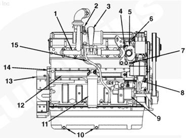 1排氣歧管,2渦輪增壓器機油進口,3渦輪增壓器,4節(jié)溫器殼通風口,5節(jié)溫器殼,6發(fā)動機冷卻液出口,7冷卻液溫度傳感器,8水泵,9冷卻液濾清器,10發(fā)動機放油口,11組合式全流/旁通機油濾清器,12機油冷卻器,13飛輪殼,14發(fā)動機生產(chǎn)序號(ESN),15渦輪增壓器機油回油口。